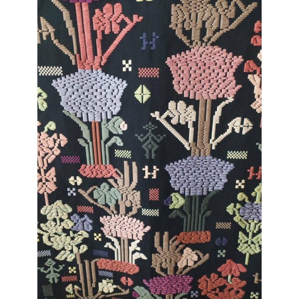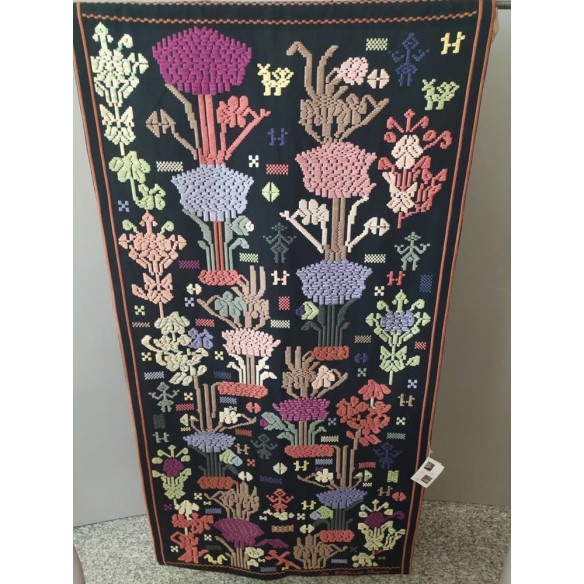 Realizzato con trama e ordito in cotone nero, le decorazioni sono realizzate in seta tinta con colori vegetali. I disegni vennero studiati da Eugenio Tavolara ispirandosi ai motivi della tradizione ma da lui interpretati liberamente nella composizione.